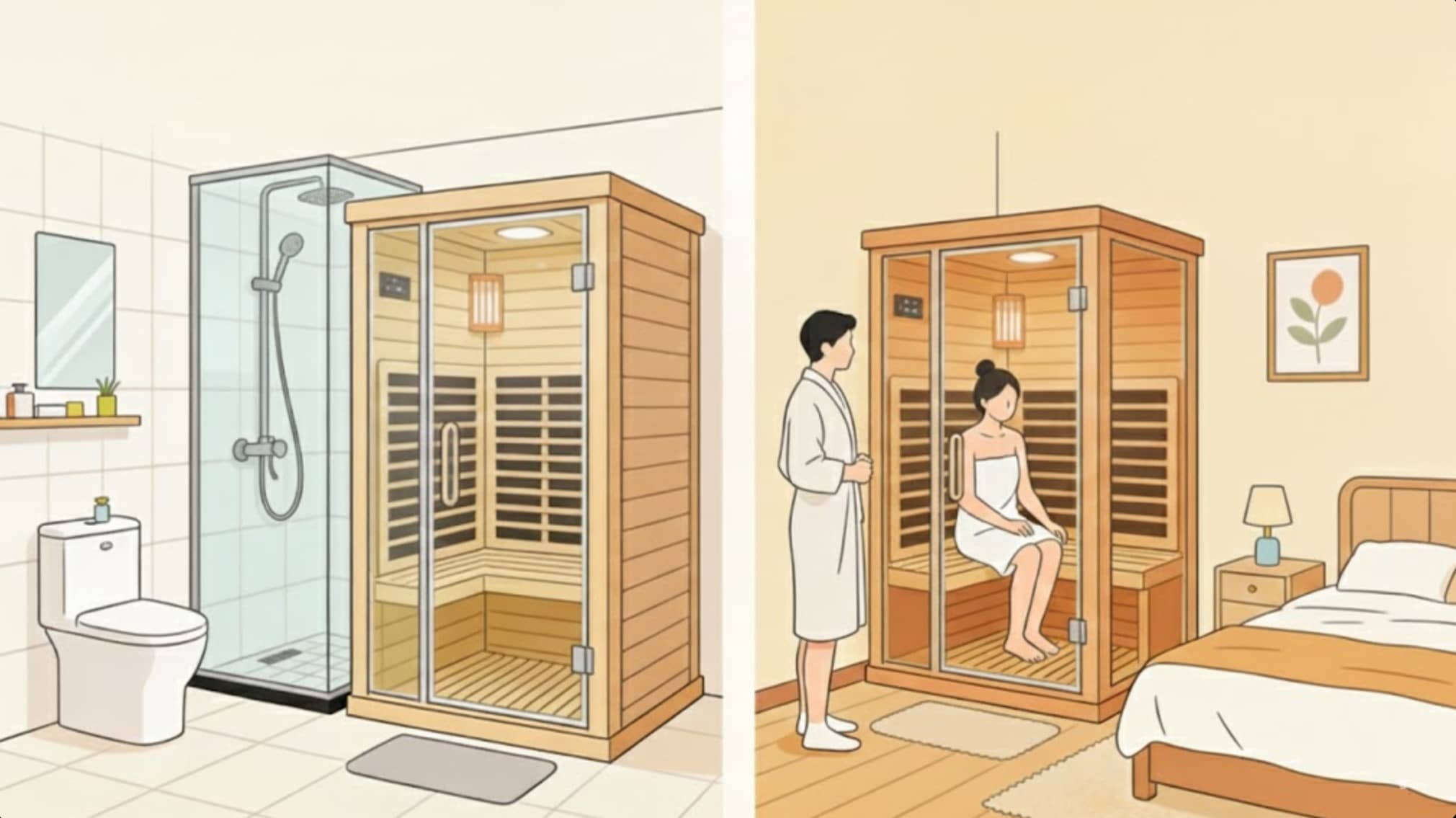 Instalazio-espazioa: lurrun-saunek ur-hornidura eta drainatze-hodi erreserbatuak behar dituzte eta espazioaren hermetikotasunerako baldintza handiak dituzte (bainugela berritzeko edo gune dedikatuetarako egokiak); infragorri urruneko saunek ez dute ur hornidurarik eta drainatzerik behar, energia iturri bat baino ez. Pertsona bakarreko modelo txikiek 0,5-1㎡ espazioa bakarrik hartzen dute eta malgutasunez jar daitezke logeletan edo balkoietan.