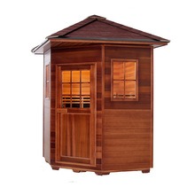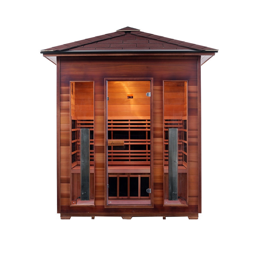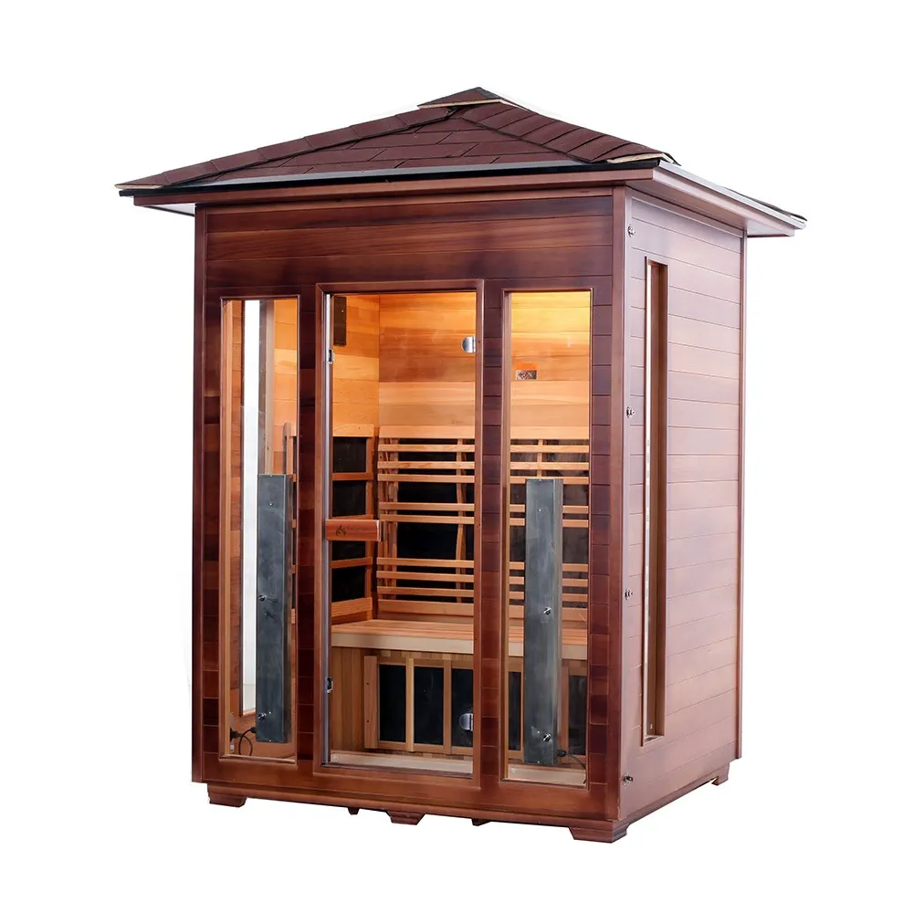 Kanpoko sauna hau Kanadako Mendebaldeko Zedro Gorriarekin edo Kanadako Hemlockarekin egina dago. Egurra korrosioarekiko eta hezetasunarekiko erresistentzia du, baita egitura-egonkortasuna ere. Infragorri urruneko karbono-zuntzezko berogailu teknologiaz hornituta, azkar berotzen da eta beroa uniformeki banatzen du. Kanpoko inguruneetarako egokia da, hala nola patioak, balkoiak, txalet lorategiak, igerilekuen eremuak eta estazioak.